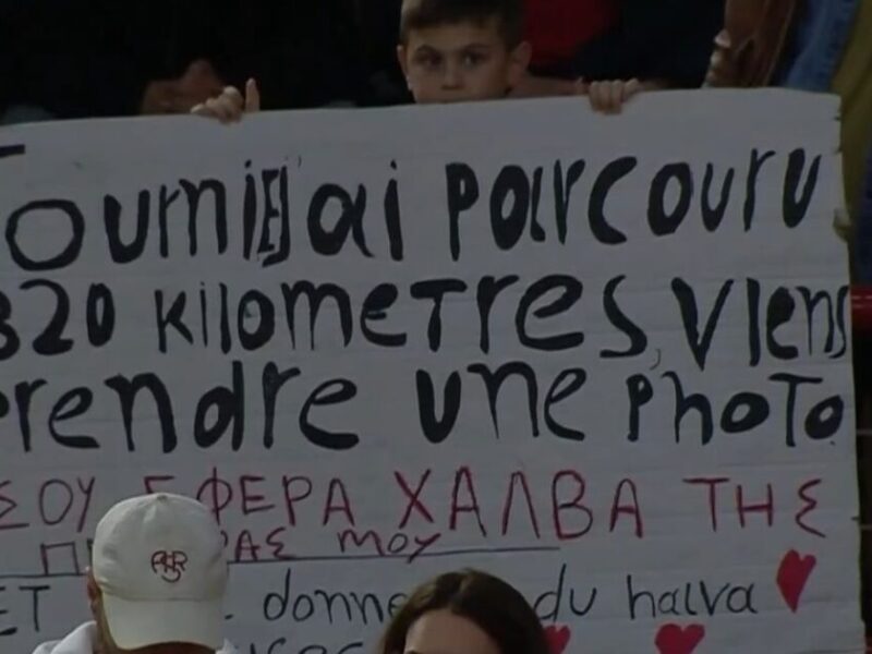 “Σου έφερε χαλβά της πεθεράς μου”, έγραφε επίσης το πλακάτ, με αποτέλεσμα να γίνει φυσικά viral, για το χιούμορ του φίλου του Ολυμπιακού, που δεν κατάφερε όμως να δει τον Εβάν Φουρνιέ να αγωνίζεται.