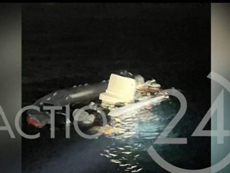 Συγκεκριμένα, στις φωτογραφίες που προέβαλε το Action24, φαίνεται το φουσκωτό με τους μετανάστες έξω από τη Χίο να είναι μισοβυθισμένο από την μπροστά δεξιά πλευρά του.