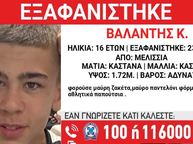 Κινητοποίηση της αστυνομίας στα Μελίσσια Αττικής για την εξαφάνιση του Βαλάντη Κ., ηλικίας 16 ετών. Σχετική ανακοίνωση δόθηκε στη δημοσιότητα από το «Χαμόγελο του Παιδιού», τις πρώτες πρωινές ώρες του Σαββάτου (25.04.2026).