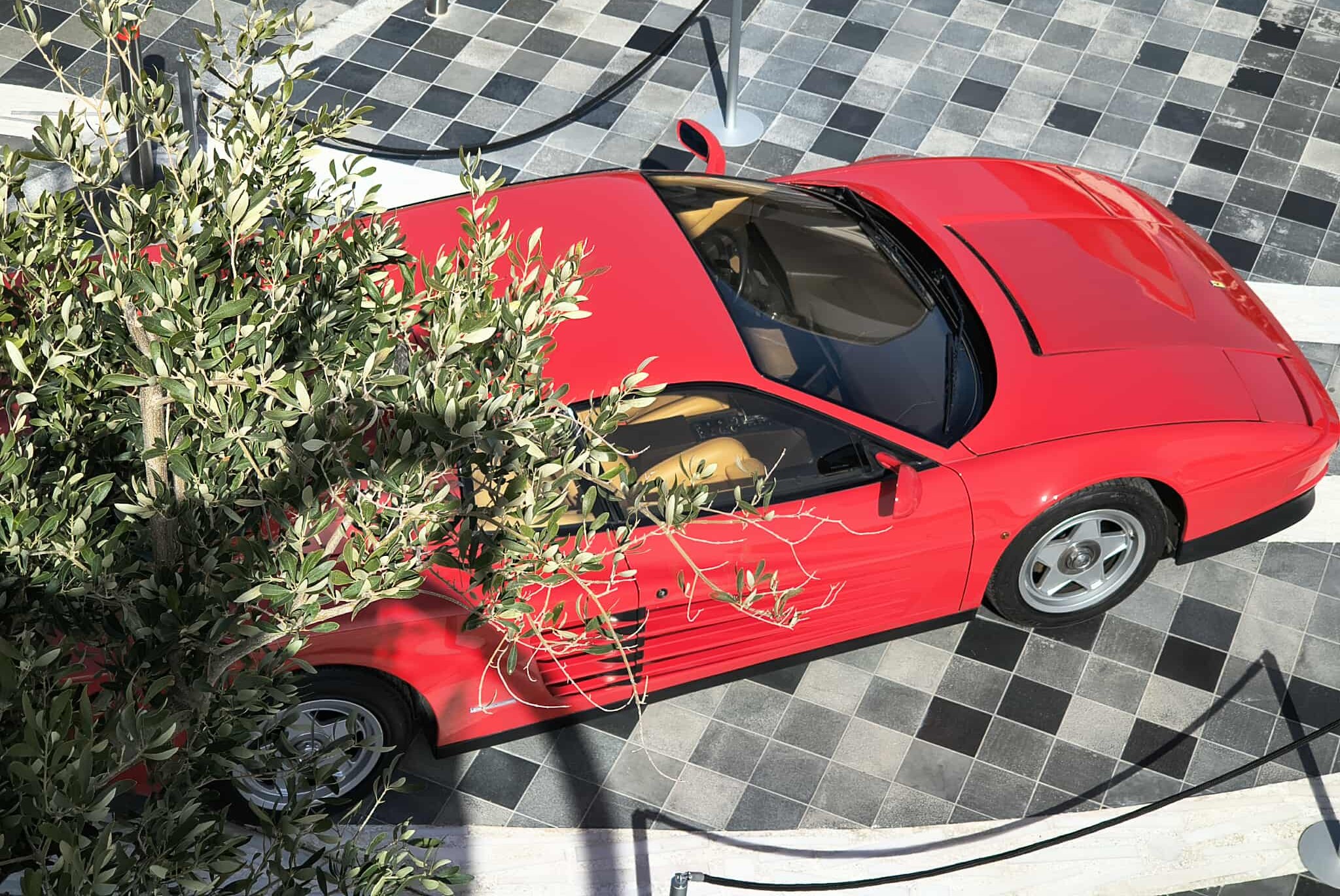 Με τις ιστορικές πινακίδες να μαρτυρούν τη συλλεκτική της αξία, η συγκεκριμένη Ferrari Testarossa στέκεται επιβλητικά ανάμεσα σε πολυτελή καταστήματα όπως της Loro Piana, θυμίζοντας σε όλους γιατί το Maranello παραμένει ο αδιαμφισβήτητος βασιλιάς του στιλ