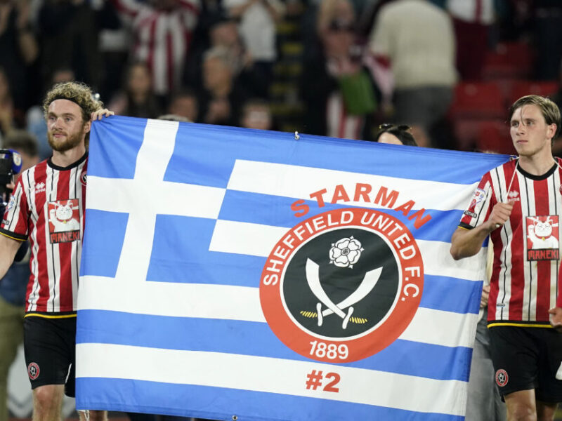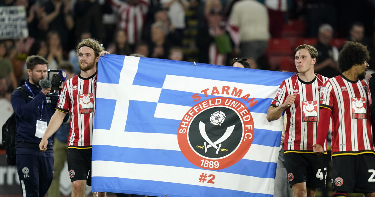 Η ελληνική σημαία για τον Τζορτζ Μπάλντοκ σε αγώνα της Σέφιλντ Γιουνάιτεντ / Reuters / (Credit Image: © Andrew Yates/Sportimage/Cal Sport Media) (Cal Sport Media via AP Images)