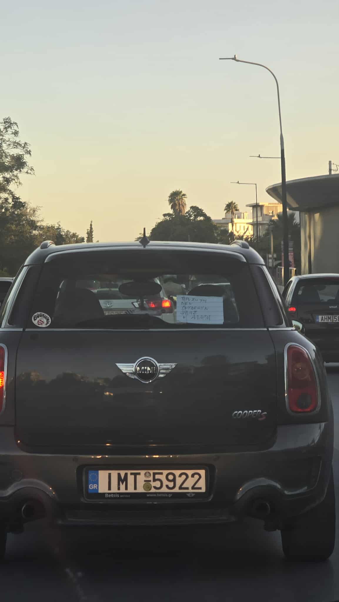 Σε μια από τις πιο κεντρικές λεωφόρους της Αθήνας, ένα MINI Countryman κατάφερε να τραβήξει όλα τα βλέμματα. Όχι για την εμφάνισή του ή τις επιδόσεις του -είναι τo Cooper S άλλωστε, αλλά για ένα αυτοσχέδιο μήνυμα που είχε κολλημένο στο πίσω τζάμι.