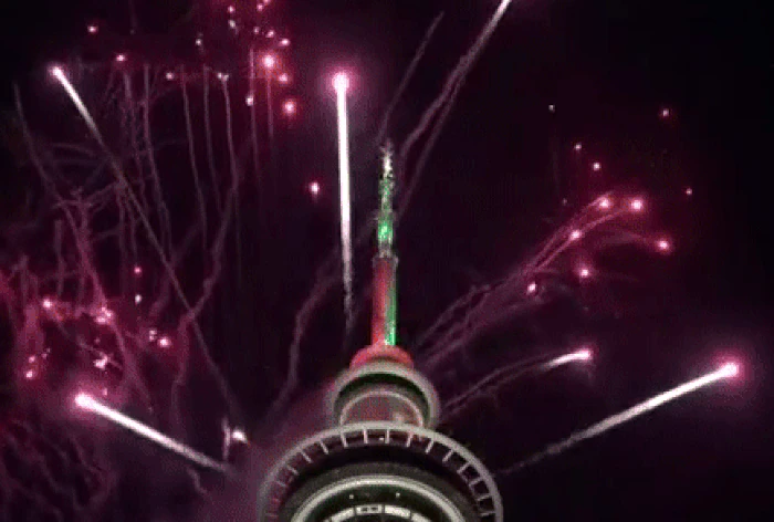 Η πεντάλεπτη επίδειξη περιελάμβανε 3.500 πυροτεχνήματα που εκτοξεύτηκαν από διάφορους ορόφους του πύργου ύψους 240 μέτρων, του ψηλότερου κτιρίου της Νέας Ζηλανδίας.