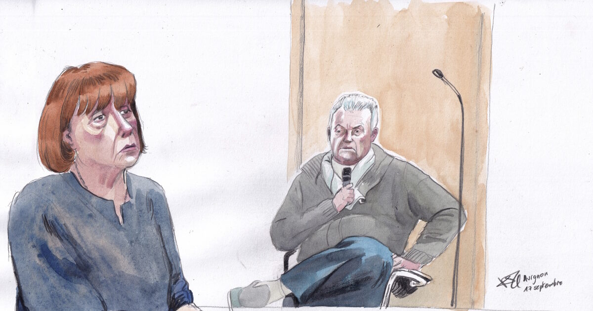 Σκίτσο της αίθουσας του δικαστηρίου από τον Valentin Pasquier δείχνει την Gisèle Pelicot, αριστερά, και τον πρώην σύζυγό της Dominique Pelicot, δεξιά, κατά τη διάρκεια της δίκης του στο δικαστήριο της Αβινιόν, στη νότια Γαλλία / AP Photo/Valentin Pasquier, File