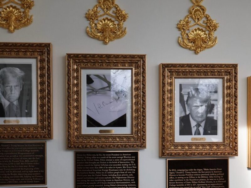 Η πινακίδα για τον πρώην πρόεδρο Τζο Μπάιντεν, ο οποίος απεικονίζεται με φωτογραφία αυτόματης συσκευής υπογραφής (autopen), υιοθετεί γνωστές επικρίσεις του Τραμπ.