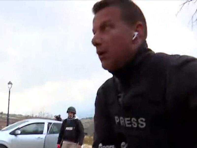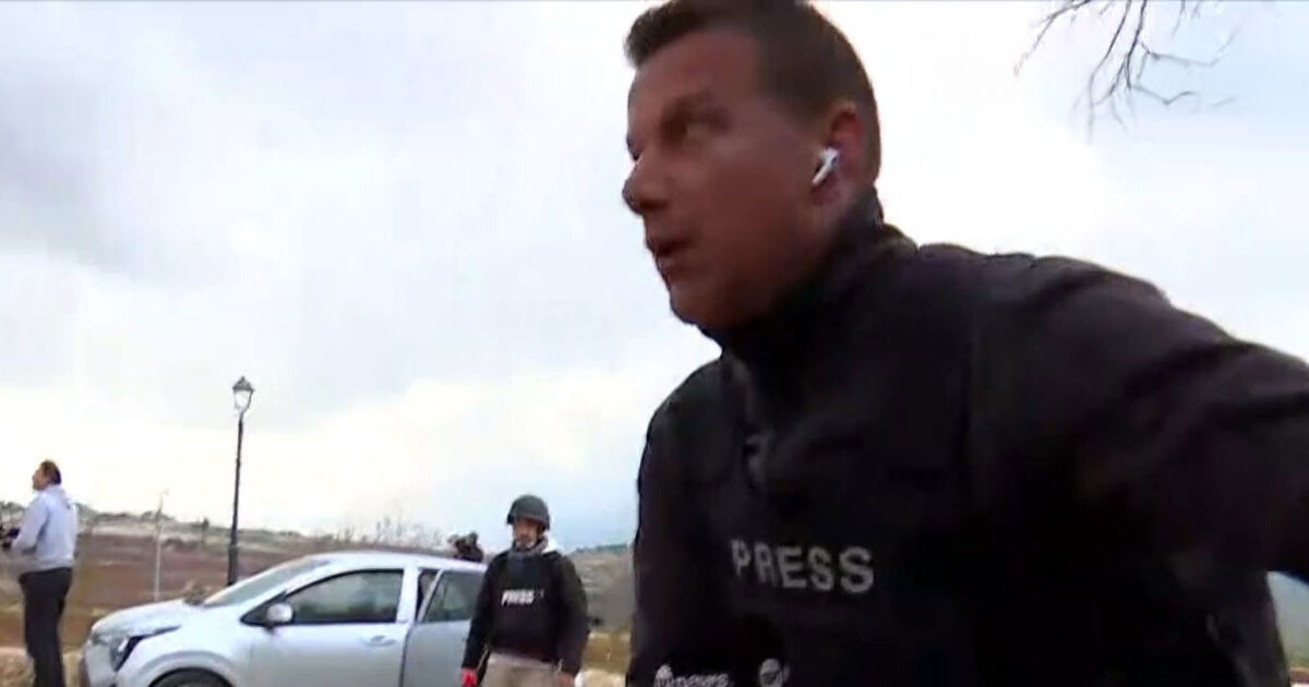 Ο δημοσιογράφος καλούσε τους συναδέλφους του στην κάμερα και τον ήχο, Φώτη Πάντο και Παναγιώτα Δερβιτσιώτη να καθίσουν κάτω για να προστατευθούν.